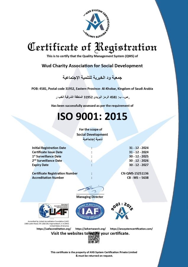 بفضل الله ثم بجهود فريقنا المميز، يسرنا أن نعلن عن تجديد شهادة الجودة لجمعية ود الخيرية ، هذا الإنجاز يعكس التزامنا المستمر بالتميز وتحقيق أعلى معايير الكفاءة لخدمة المستفيدين نسعى دائمًا لتطوير خدماتنا وتحقيق أثر إيجابي في مجتمعنا. شكرًا لدعمكم وثقتكم المستمرة